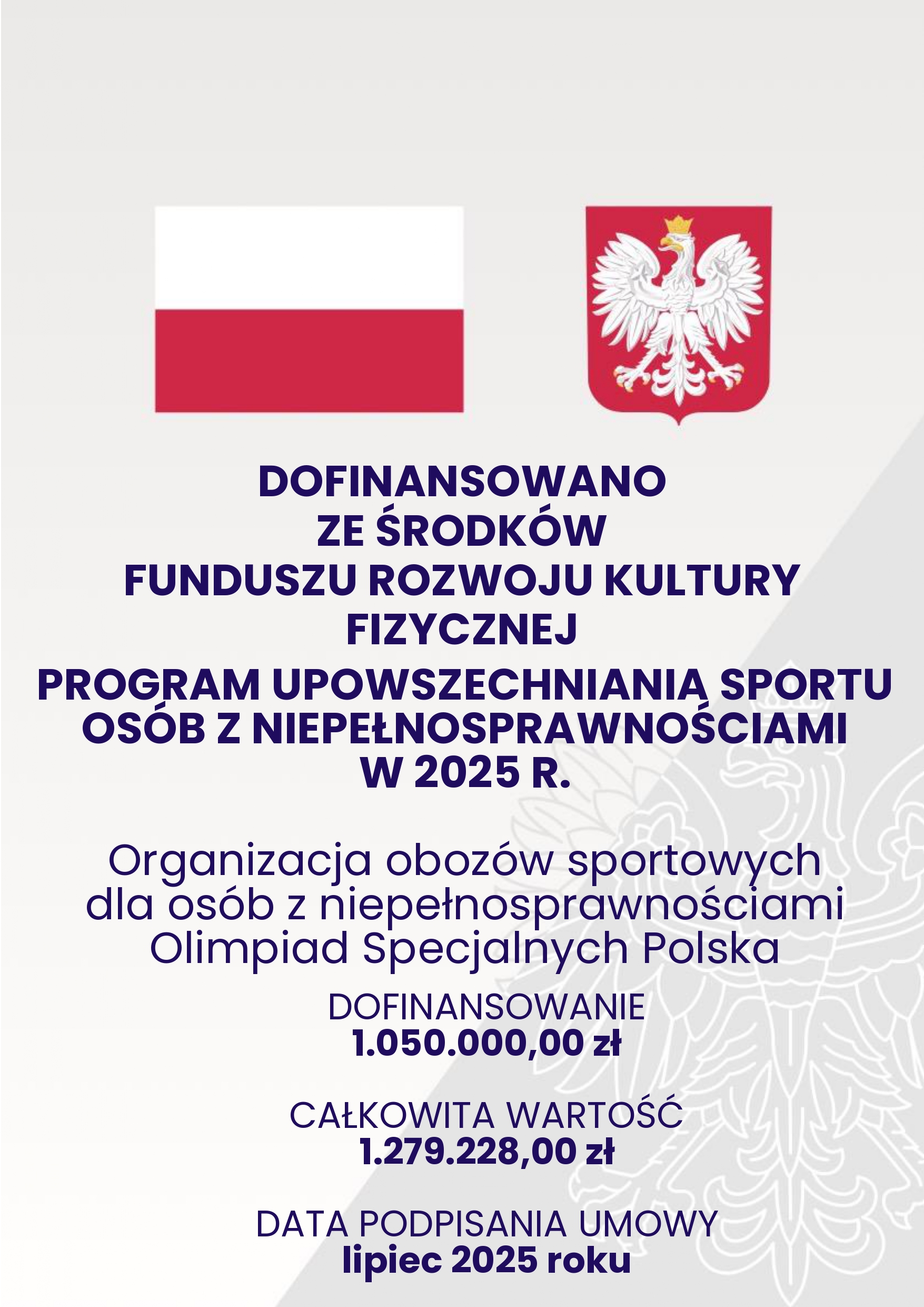 Oddział Regionalny Olimpiady Specjalne Polska Wielkopolskie-Konin od 2 stycznia 2025 r. do 31 grudnia 2025 r. realizuje zajęcia sportowe dofinansowaniu ze środków Ministerstwa Sportu i Turystyki Funduszu Rozwoju Kultury Fizycznej, zgodnie z umową nr. 2025.0089/0082/SubC/DS-SN/1/KZ, z dnia 5.06.2025 r. W treningach uczestniczy 145 zawodników z Klubów Olimpiad Specjalnych Oddziału Regionalnego [...]