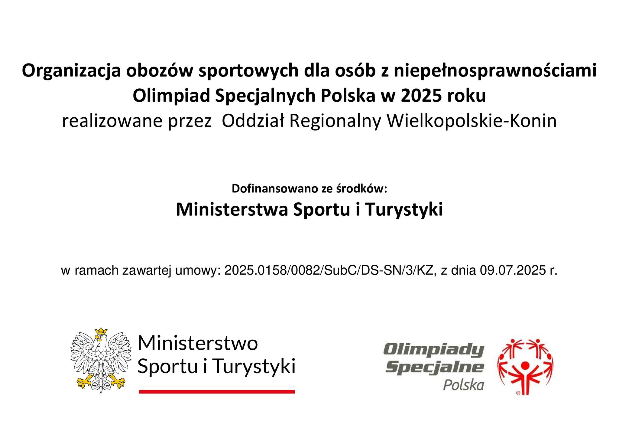Oddział Regionalny Olimpiady Specjalne Polska Wielkopolskie- Konin jest organizatorem obozu sportowego w Zakopanem w terminie 1-8 października 2025r. Obóz dofinansowany jest ze środków Ministerstwa Sportu i Turystyki na podstawie umowy nr 2025.0158/0082/SubC/DS-SN/3/KZ, z dnia 09.07.2025 r. W obozie uczestniczyć będzie 37 zawodników z niepełnosprawnością intelektualną z 7 Klubów Olimpiad Specjalnych [...]